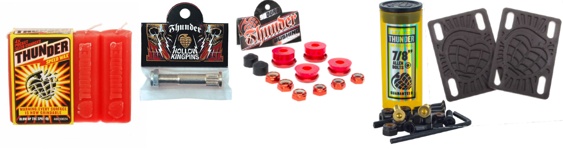 At Thunder Trucks you will find everything you need for your trucks! You can change your screws, your kingpins, to give a second youth to your trucks. You can also find wax to make good old grinds or riser pads for more comfort during your skateboarding trips.